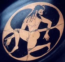 Ixion's major contribution to mythology was as the father of a whole Centaur tribe....except for Chiron, and a two or three others. We'll continue with Ixion in a moment. MYTH Chiron's origin sets him apart from all the other Centaurs. His father was Saturn (Kronus). Saturn was lusting after a sea-nymph named Phylira. There are two versions: in one, the two changed themselves into horses so they could consumate there relationship without being found out by Rhea (Saturn's wife); in the other, she tried to escape her would-be lover by changing herself into a horse to gallup away, but he changed into one also, overtook and raped her. In any event, Chiron was the child of this union. When Chiron was born, his mother was so horrified to see this aberration...half man, half horse, that she totally rejected Chiron; his father, likewise, rejected him. Quite a difficult way to begin life! But amost all of the other the Centaurs trace their lineage back to Ixion, not Saturn. (Pholus and Chariklo also were not descended from Ixion.) In Greek mythology Ixion was a descendent of Ares (Mars, to the Romans) and was king of the Lapiths (a race) in Thessaly. But not a very honorable king. For example, he married a woman named Dia, daughter of Eioneus....but decided not to pay the previosly agreed upon price for his new bride. Eioneus held, for security on the debt, some horses that belonged to Ixion. Ixion told Eioneus that if he would bring the horses to Thessaly, Eioneus would be paid what he was due...but once there, Eioneus was murdered. Like Cain in the Bible's Old Testament, Ixion has the distinction of being the first human to shed kindred blood (by killing his father-in-law to avoid making payment for his bride). To the Greeks, murder of a kinsman was a particularly horrible act....and for awhile, no human or god would purify him. Finally, Zeus (Jupiter) decided to purify Ixion (some say, because Zeus had taken an interest in Dia!) Ixion went to Olympus for the ritual. But while there, Ixion committed an even worse sin...he tried to seduce Zeus' wife, Hera (Juno)! She told her husband, who then decided to verify Ixion's guilt with a test: he took a cloud, shaped it like Hera, and breathed life into her. Then he set her where Ixion would find her. Well, Ixion took the bait, and slept with the Nephele (the fake Hera.) When Ixion came down to earth, he bragged to other mortals about sleeping with the queen of the gods. As you can imagine, Zeus was not happy with Ixion, not only for having the audacity to sleep with Hera....but for boasting about it! In punishment, Zeus bound Ixion to a winged or flaming spinning wheel upon which Ixion was forced to continuously repent: "show gratitude to your benefactor." In some stories, the wheel was placed in the sky, but the more common version has this wheel forever turning in the Underworld. The theme here is of sinner on display, not only for guilt of spilling kindered blood, but for the disrespect and betrayal in the guest/host relationship.