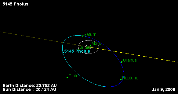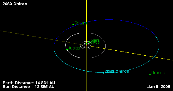 Drawings of the Centaurean orbits, showing how each relates to the other bodies of our solar system, and including the distance from the Centaurean body to the Earth, and the Sun. Orbital drawings show the bodies for January 2006. (All images calculated by this N.A.S.A. Minor Planet Orbit Plotter):