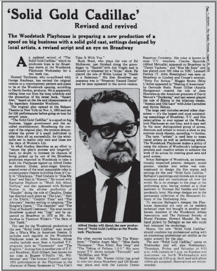 "The Solid Gold Cadillac" ran August 18-29 at the Woodstock Playhouse, Woodstock, New York. Rudy Bond was Edward L. McKeever. Other cast members: Ruth Gilbert as Mrs. Laura Partridge; Ralph Bell as Clifford Snell; Maggie Brown, Susan Gilliss, Richard Holland, Michael Martin, Leonard Patrick, Charles Reynolds, Ginger Curl and Cindy Marcus. It was directed by Alfred Drake.