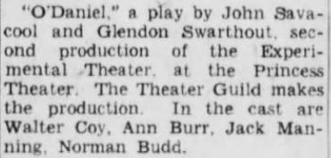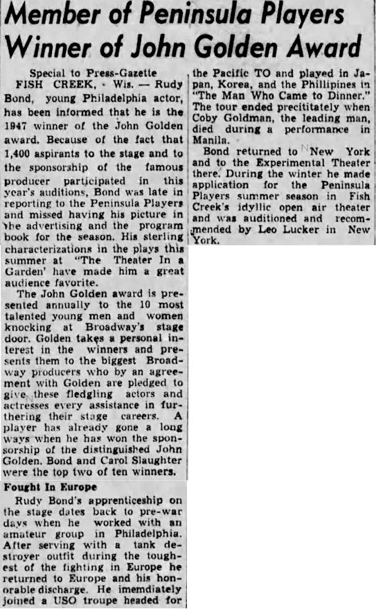 Cast members included Rudy Bond, Dorothy Hyatt, Charles Swier and Beaumont Brustle |