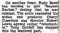 Appeared in "Boy Meets Girl" at the Playhouse in the Park, Phila, July 12-18. Robert Preston was the lead. Rudy played a character named Cutter. Other actors included: Leon Janney, Georgiann Johnson, Addison Richards, Kenneth Nelson, Earl Rowe, Val Avery, Sarah Meade, Jeanne Grace McHenry, Jerry Weiss, Marty Lahr, Priscilla McBrearty, Dan Prince, Steen Rondum, Kenneth Printz, Chuck Vogel, Claire Harootunian, Bernard Van Dieran, Albert Ottenheimer.