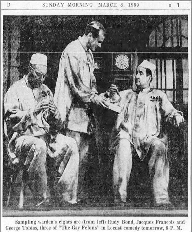 Andre (Leadhead) in "The Gay Felons". Other cast members included Josp Elic, Roger DeKoven, C.K. Alexander, George Tobias, Suzanne Bernard, Denise Darcel, Henry Sharp, Jacques Francois, Donn Driver, Sorrell Booke, Josette Banzet, Alan Ansara, Gregory Morton, Carmen Pizzi, Raymond Bramley. Open February 12 in Wilmington, DE, and closed March 14 at Ford's in Baltimore, MD.