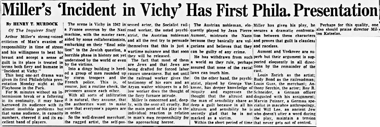 Bayard in "Incident At Vichy". Roy Scheider played the Major. Other cast members were Jean Pierre Aumont, George Voskovec, Anthony Serchio, Louis Guss, Louis Zorich, Leslie Barrett, Marvin Peisner, Sirri Murad, Gregg Weir, Will Lee. Playhouse in the Park, Philadelphia.