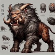 In another version, as in the above picture, Taowu is depicted as having the body of a wild boar or a tiger, emphasizing its brute strength and ferocity. It might have thick, coarse fur, sharp tusks or fangs, and a fearsome expression. Some depictions include elements such as horns or a mane, adding to its wild and untamed appearance. The overall look of Taowu is intimidating, showcasing its stubborn and destructive nature.
