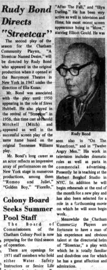 For their 1970-71 season, the Chatham Community Players (Chatham, NJ) produced "A Streetcar Named Desire." And Rudy was hired to direct the production! Opening night was February 26, 1971, and it was performed in the Chatham Senior High School Auditorium. Jim Kirkwood played Stanley, Glenie Phillips was Stella, Peter Kerns was Steve, Victor Kuring was Mitch and Rozanne Kuring was Blanche.