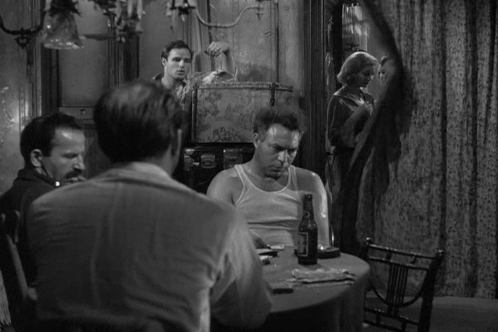 Here is a scene from the original Broadway version of the play. Left to right, that's Kim Hunter, Nick Dennis, Marlon Brando and Rudy Bond.