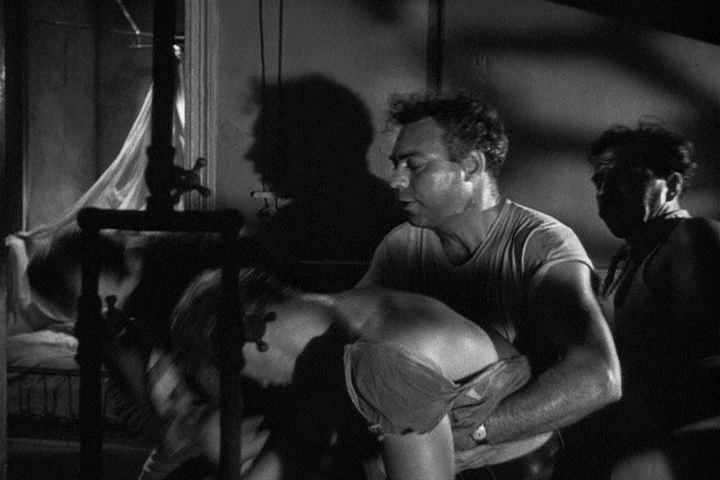 Stanley loses his temper at Blanche at one point, and the guys drag him to the shower with Steve holding him under the water to cool him off: